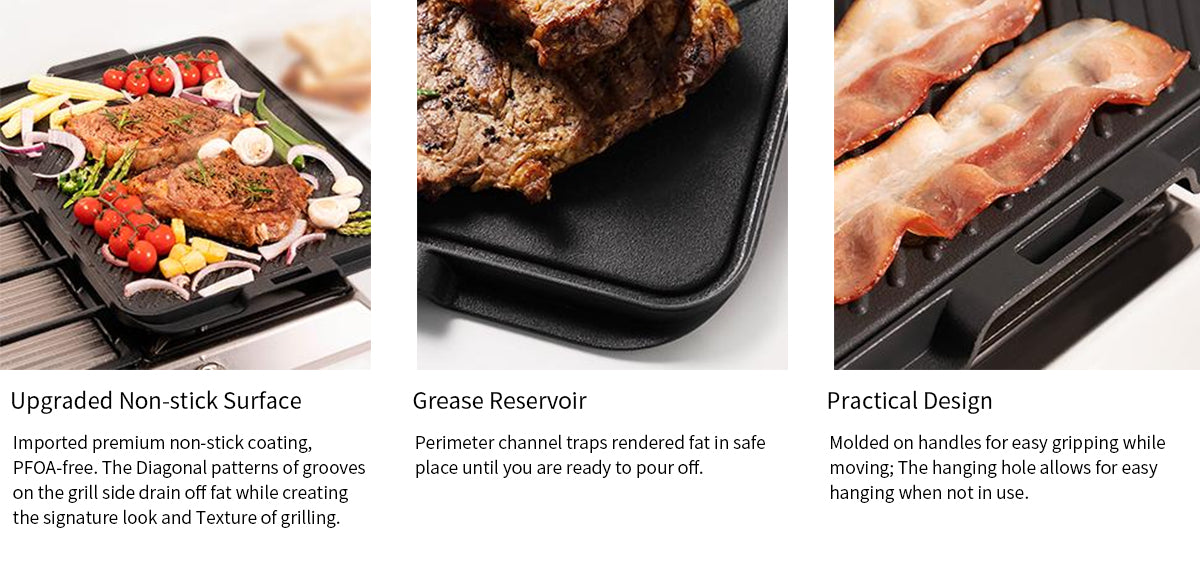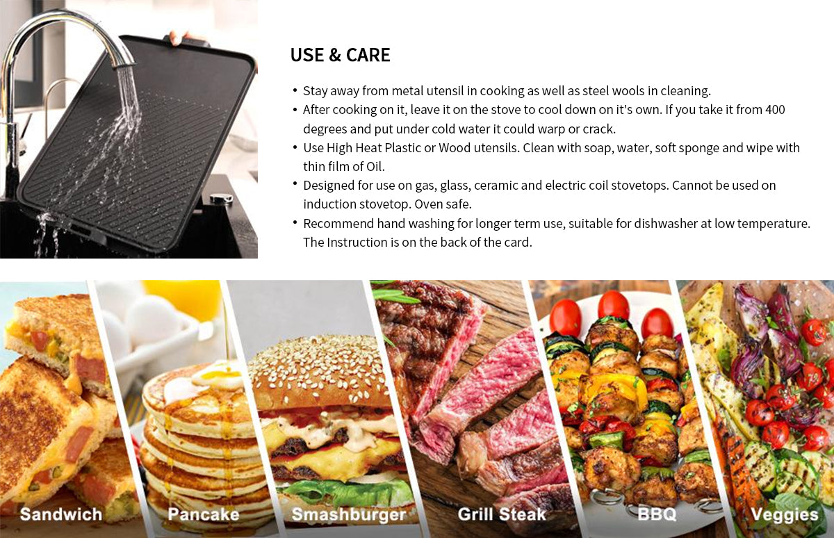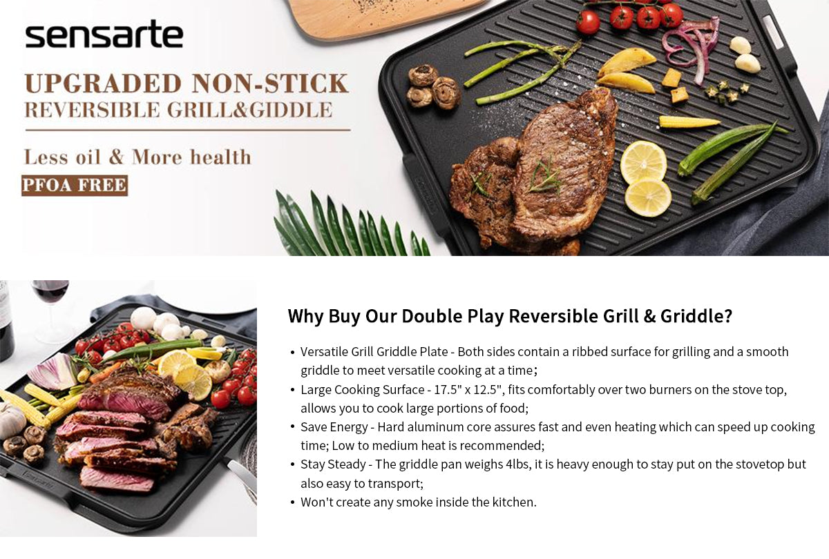 - Reversible Grill & Griddle - This stone cookware is reversible. One side is flat griddle, you can cook pancakes or sandwiches on it, and the other is ribbed grill, it's best for grilling steaks or veggies.