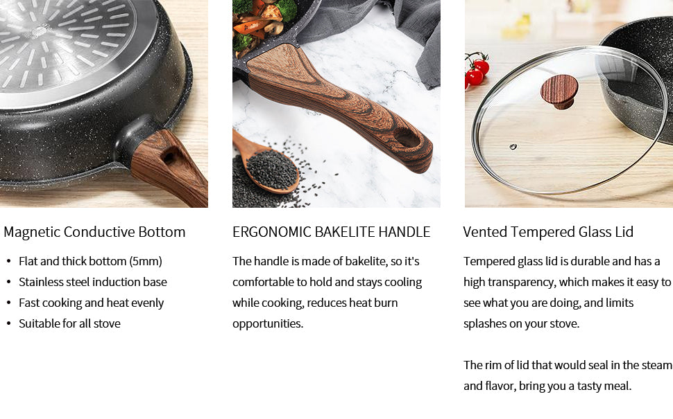 - Glass Lid & Stay-cool Handle - Durable tempered glass lid makes it comvenient to see the cooking process and limits splashes on your stove. Woodgrain bakelite handle is comfortable to grip and stays cool while cooking. Oven safe to 302°F.