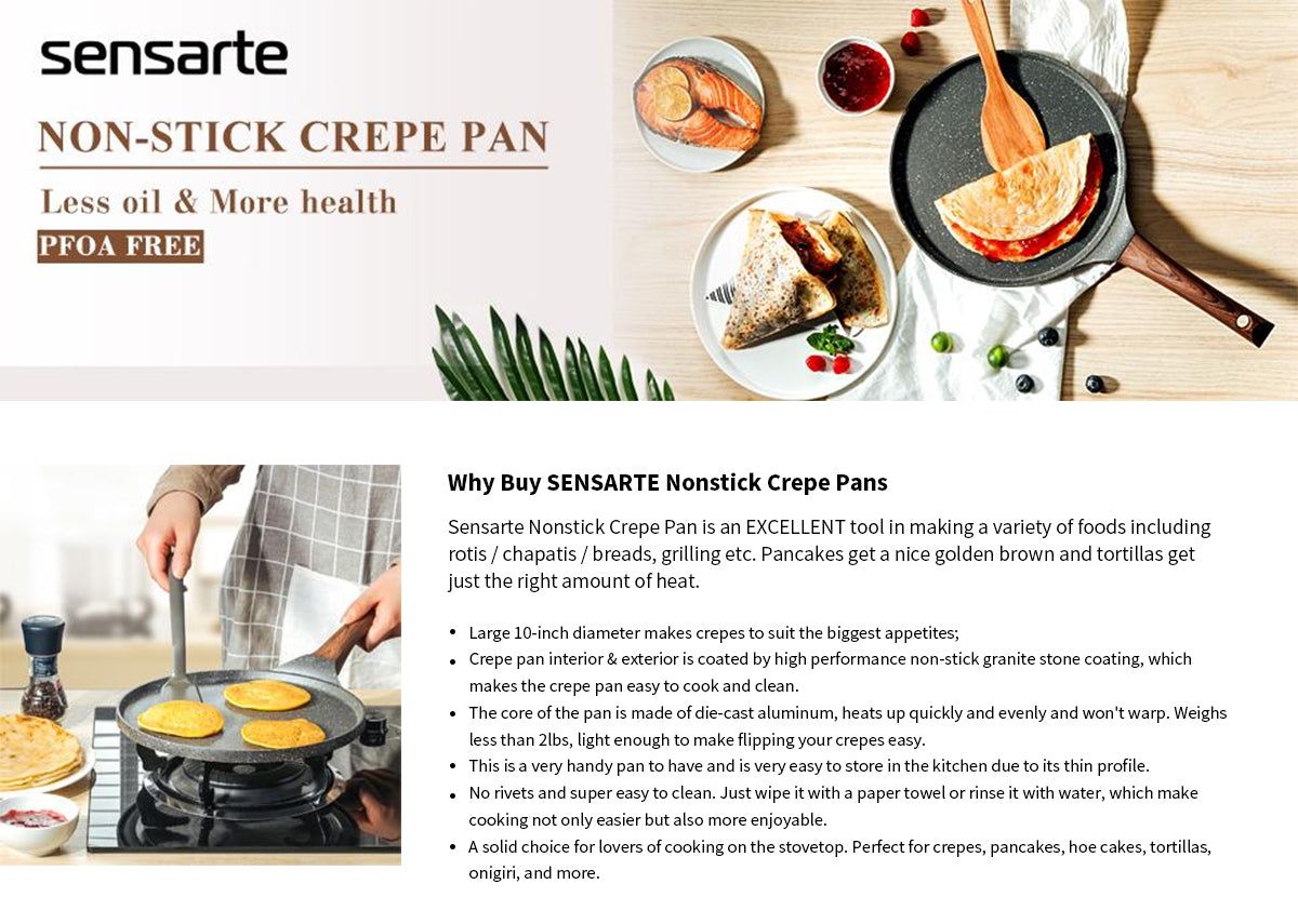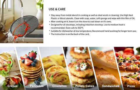 - Suitable For All Stoves - High magnetic conductive stainless steel base allows the pancake pan to work on all cooktops, including induction. The core of the crepe pan is die cast aluminum, which is durable and heats up quickly and evenly.