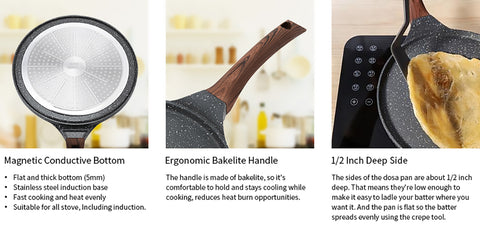 - Lightweight & Safe - Weighs 2lbs. This non-stick dosa pan is light enough to make flipping your crepes easy and move around the kitchen; Its Heat Resistant Bakelite Handle is suitable for grasping and staying cooling while cooking. Oven safe to 302°F.